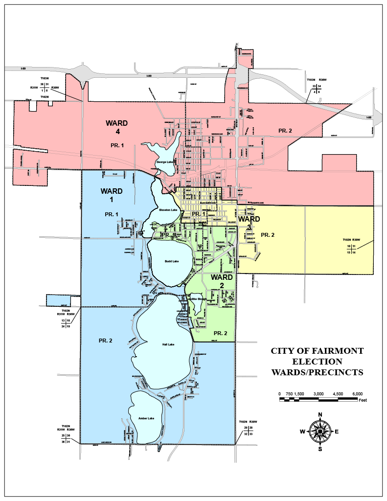 The city of Fairmont is divided into four wards. I am running for the Ward 1 seat. This map shows where the ward boundaries are. This is a smaller version of the official map, which you can find at the city's website.